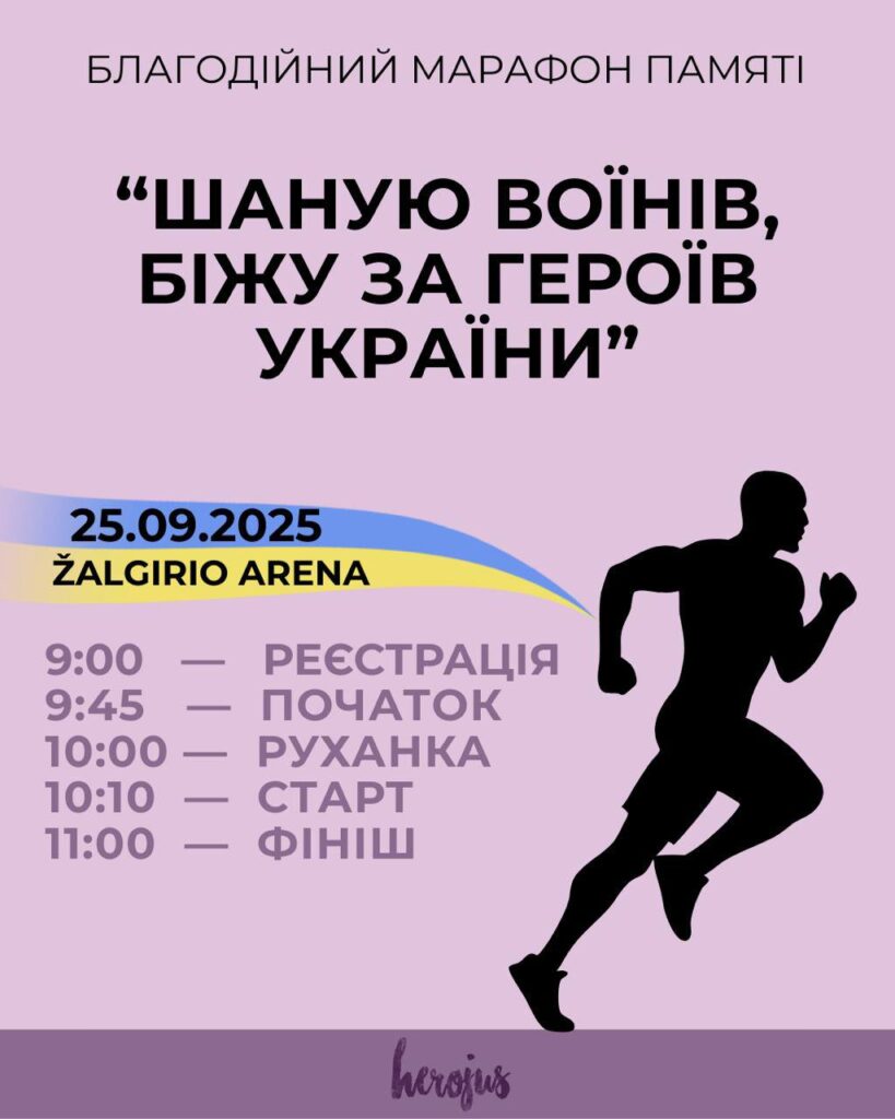 Благодійний марафон памяті “Шаную воїнів, біжу за героїв України”. Разом зі школою “HEROJUS” запрошуємо вас взяти участь у благодійному марафоніпам’яті,який відбудеться 25 вересня 2025 року біля Žalgirio arena. Початок – 9:00. Кожен ваш крок – це крок у пам’ять про Героїв України 💛💙 Мета благодійного марафону “ШАНУЮ ВОЇНІВ, БІЖУ ЗА ГЕРОЇВ УКРАЇНИ”: